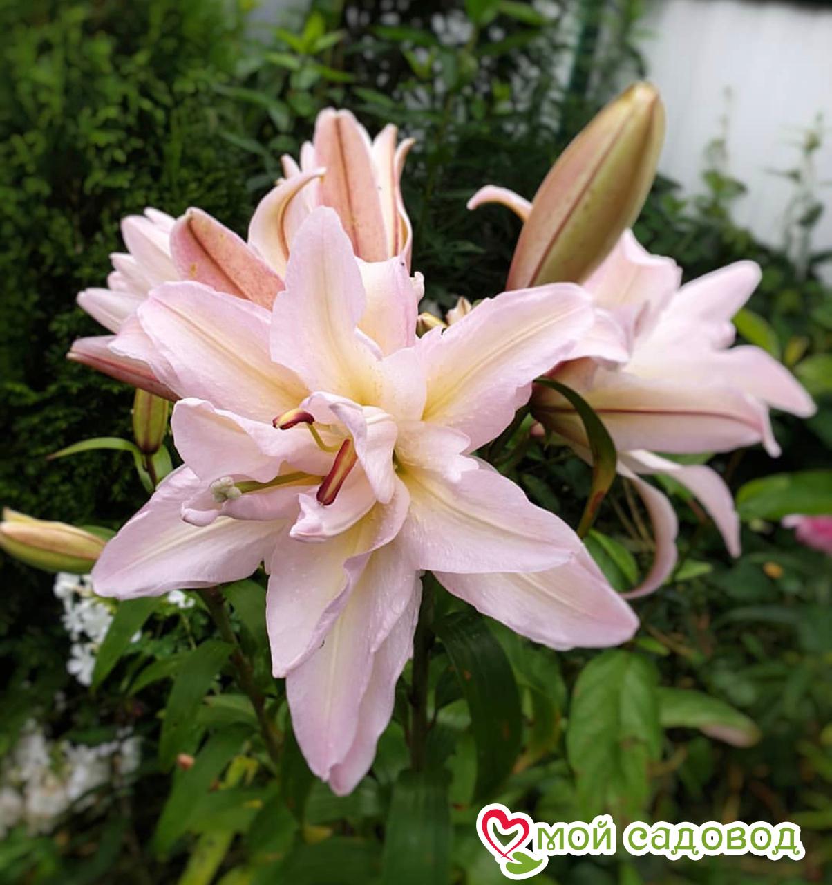 Махровая лилия Роберта — Восточный гибрид. Цветы махровые, до 20 см в диаметре, нежно-розовые с жемчужно-белыми переливами и желтыми полосами. Без пыльцы. Цветки направлены вверх и в стороны. Зацветают в конце июля-начале августа, имеют насыщенный аромат. Высота растения 100 см. Отличается не только красотой, но и аккуратностью! Ее тычинки без пыльцы, а значит лепестки всегда чистые . ПОСАДКА. Высадку на клумбу можно производить как весной, так и летом, и осенью. Глубина посадки луковиц лилий зависит от их размера. Большим луковицам нужна ямка глубиной 15-20 см, также нужно дополнительно сделать углубление для корней – 10 см. Низкорослые сорта высаживают на глубину – 10-12 см и дополнительно 10 см для корней. Детки можно прикапывать на глубину 4-5 см. Как сохранить луковицы лилии до посадки  Если купить посадочный материал раньше времени, то возникнет актуальный вопрос — как правильно сохранить луковицы лилий до посадки в открытый грунт весной? Отправить на хранение можно по следующей схеме: Сначала нужно немного просушить посадочный материал — положите их на бумагу в помещении с хорошим проветриванием. Но не на солнце, а в полутень. Затем наполните пакет ( в нем должны быть отверстия для вентиляции) опилками, торфом или сфагнумом. Положите в пакет луковицы в вертикальном положении донцем вниз. Поместите пакет в помещение, в котором стабильно поддерживается температура 2-6 градусов тепла, например, в холодильник, погреб, подвал. При хранении регулярно проверяйте материал на наличие гнили, ростков.